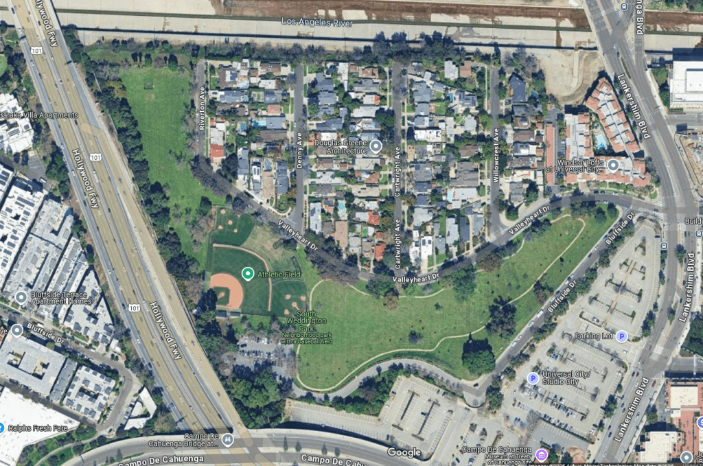 The cops arrival would disburse the crowd remarkably fast when they rolled up because they were easily spotted due to the park being accessible only by two streets: Bluffside Drive to the east and Valleyheart Drive to the north. The park boundary was wedged between CA 101 to the west and the concrete L.A. River (a.k.a. “the wash”) to the north, and it was easy to ditch the cops along the verge of the 101 or the verge between the wash and the residential houses in the tony little neighborhood.