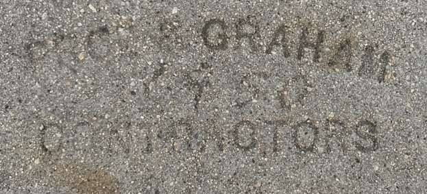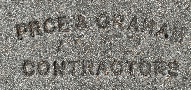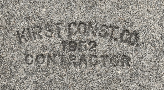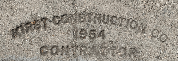 There are concrete stamps in the sidewalks with the contractor’s names and the year the concrete was poured. I’ve identified the following stamps around the neighborhood: