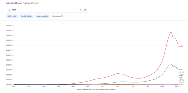Google Books Ngram Viewer for hello https://books.google.com/ngrams/graph?content=hello&year_start=1800&year_end=2022&corpus=en-2019&smoothing=7&case_insensitive=true